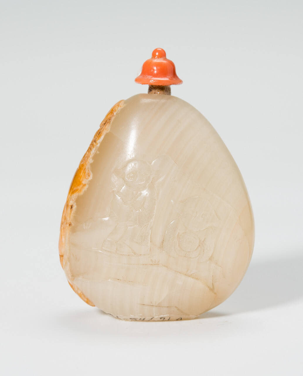 DescriptionOf natural pebble form, with indented base, the grayish-white stone with thin, parallel striations encircling the pebble, carved in low relief with two boys sitting on rocks, a long light brown suffusion down one side used to depict two other figures.