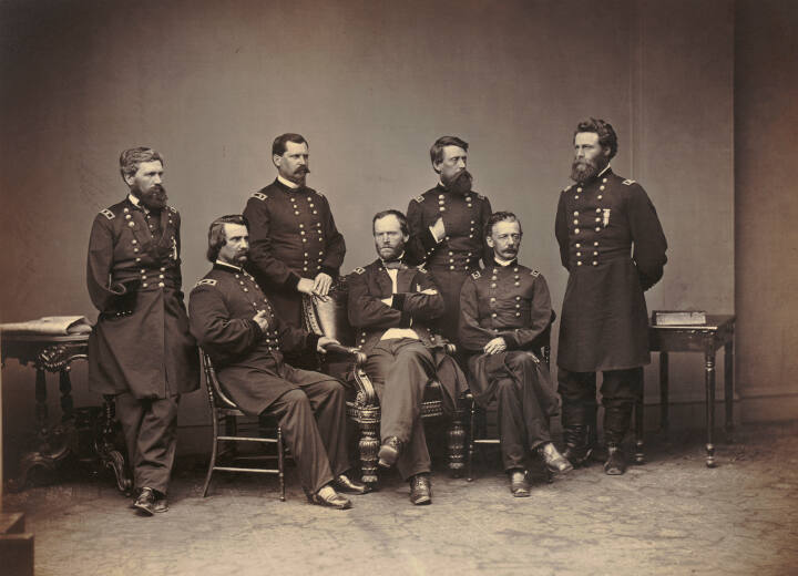 DescriptionImage of seven men dressed in uniforms with matching jackets, four standing and three seated. The man in the center is seated with his jacked unbuttoned and his arms crossed. Figures depicted from left to right: Oliver Otis Howard, John A. Logan, Willaim B. Hazen, William T. Sherman, Jefferson C. Davis, Henry Warner Slocum, and Joseph A. Mower.Exhibition HistoryRotation 5. The Nelson-Atkins Museum of Art, Kansas City, MO, January 15 – July 9, 2009, no cat.