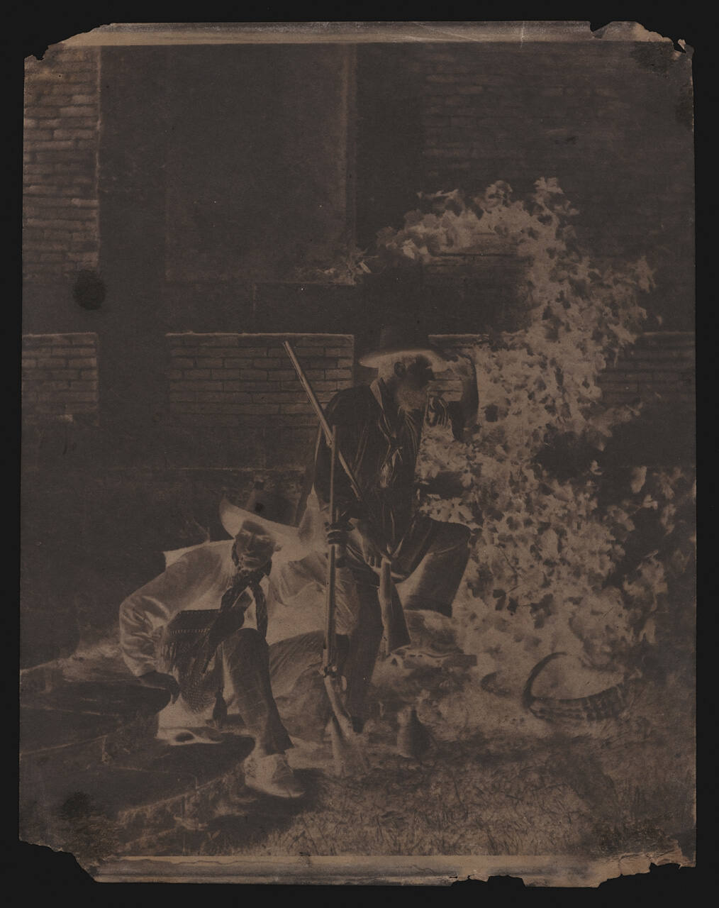 DescriptionImage of two hunters, one sitting with his rifle resting against his knee, the other standing and holding his rifle. They are both outside; a tree and a basket lie before them; the background is some sort of brick structure.Gallery LabelInfluenced by his love of Dutch genre painting, which featured scenes of everyday life, Baron Humbert de Molard posed his friends and employees enacting countryside activities like hunting. A sophisticated amateur from a wealthy family, he was free to explore his personal passions and used his château in Normandy, France, to stage his photographs.