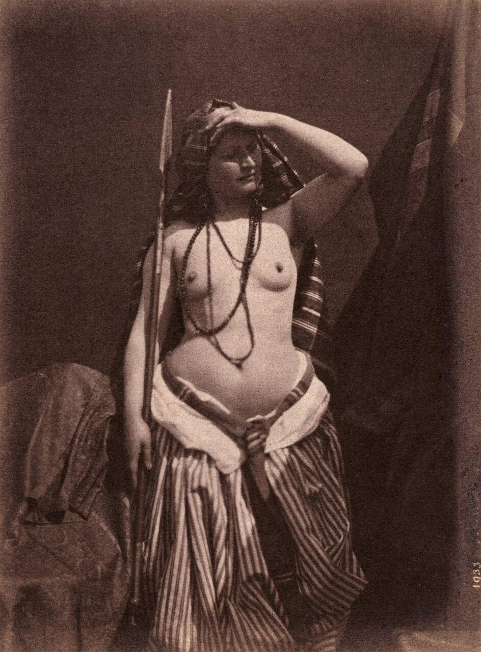 DescriptionImage of a woman, nude from the waist up, wearing a head cloth and a striped skirt. She holds a spear in her right hand and her head is tilted to the side as she shields it with her left hand.ProvenancePurchased from Charles Isaacs Photographs Inc., New York, NY by The Hall Family Foundation, Kansas City, MO, 2008;