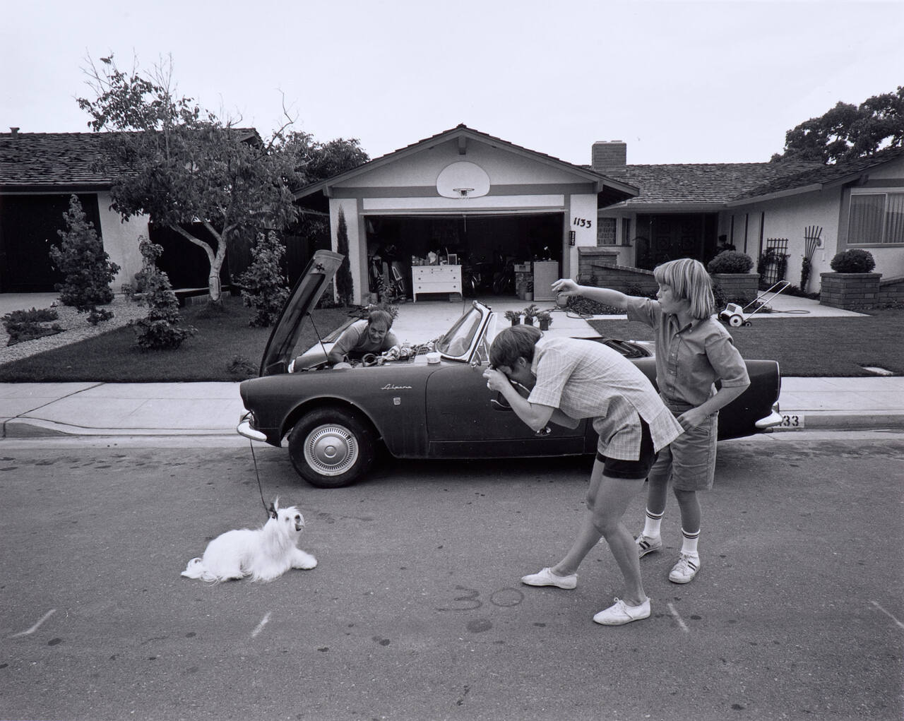 DescriptionImage of two people standing on a residential street taking a photograph of small white dog. Behind them a man works on his car with the hood raised.