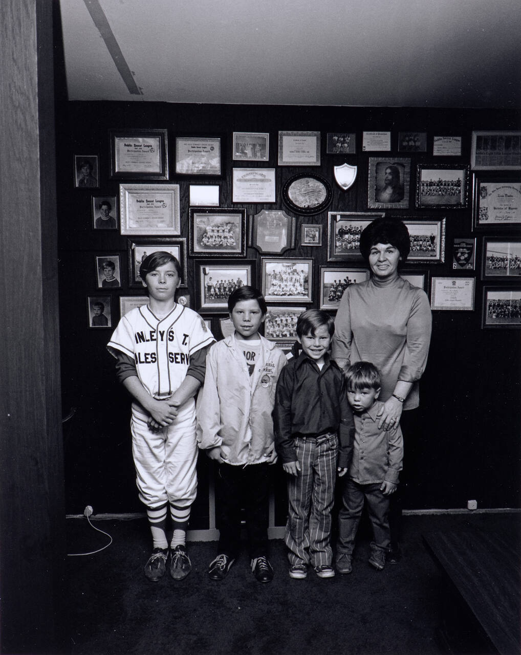 DescriptionWoman standing with four boys, arranged in descending height order in front of a wall full of framed award certificates. Portfolio.