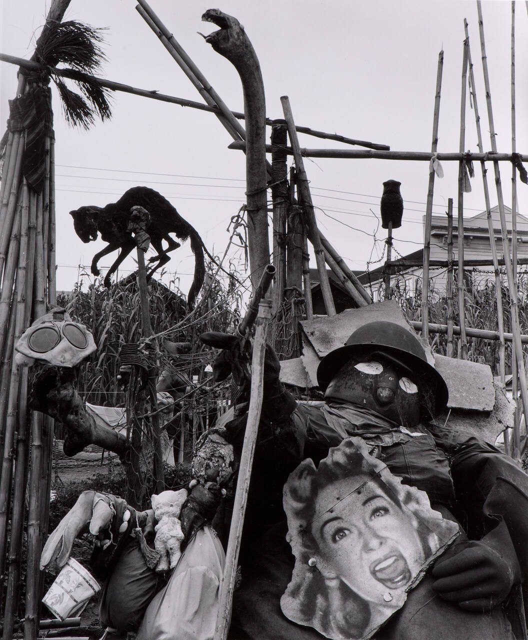 DescriptionNew York, scarecrow and junk. FG; scarecrow in from BR to CR, with right hand being held up by a stick with middle finger extended. Left hand is 'holding' a cut out picture of a pretty woman screaming. Image of black cat held up on a stick in CL, silouetted by the white sky. MG; bamboo sticks are standing on in. BG; corn growing and houses.Copyright© The Brett Weston Archive