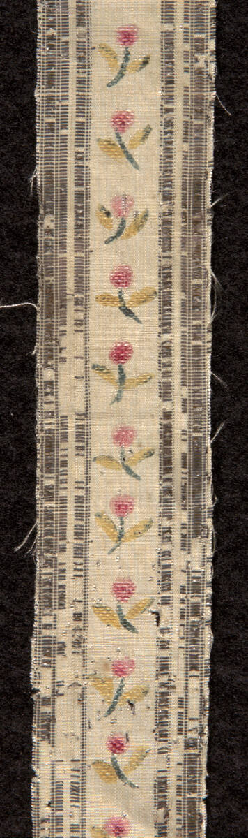 DescriptionSingle strip from a striped fabric. Cream silk with stripes of supplementary silver weft and polychrome painted flowers.