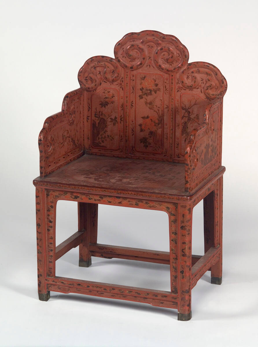 DescriptionRed lacquer chair decorated with flowers, trees and birds, with scroll patterns along the tops of the arms and back.Provenance