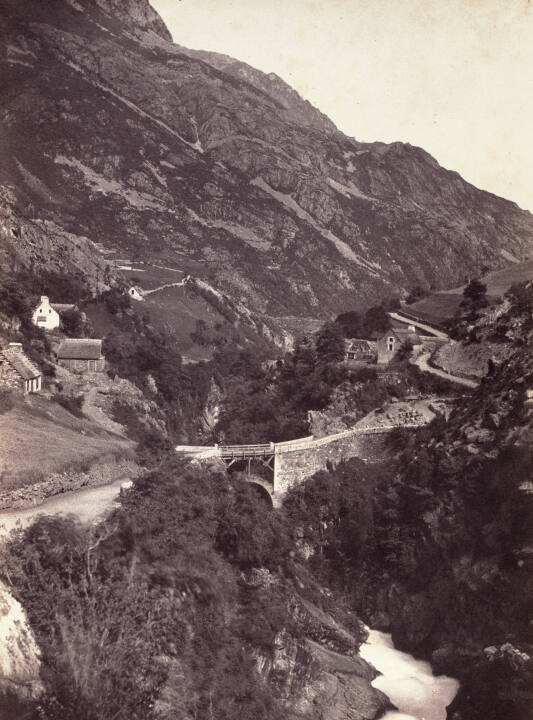 Joseph Vigier, a founding member of the Société Héliographique in Paris, was a student of Gustave Le Gray. While traveling through the Pyrenees in the summer of 1853, Vigier produced several hundred mountain views (along with some views of Spain). Soon after, he published a small-edition album of 38 prints, the Album des Pyrénées, which represented his finest work and was regarded as a tour de force by his contemporaries. This particular view, one of 16 in the album made in and around the St. Saveur region, is characteristic of Vigier’s carefully composed scenes.
