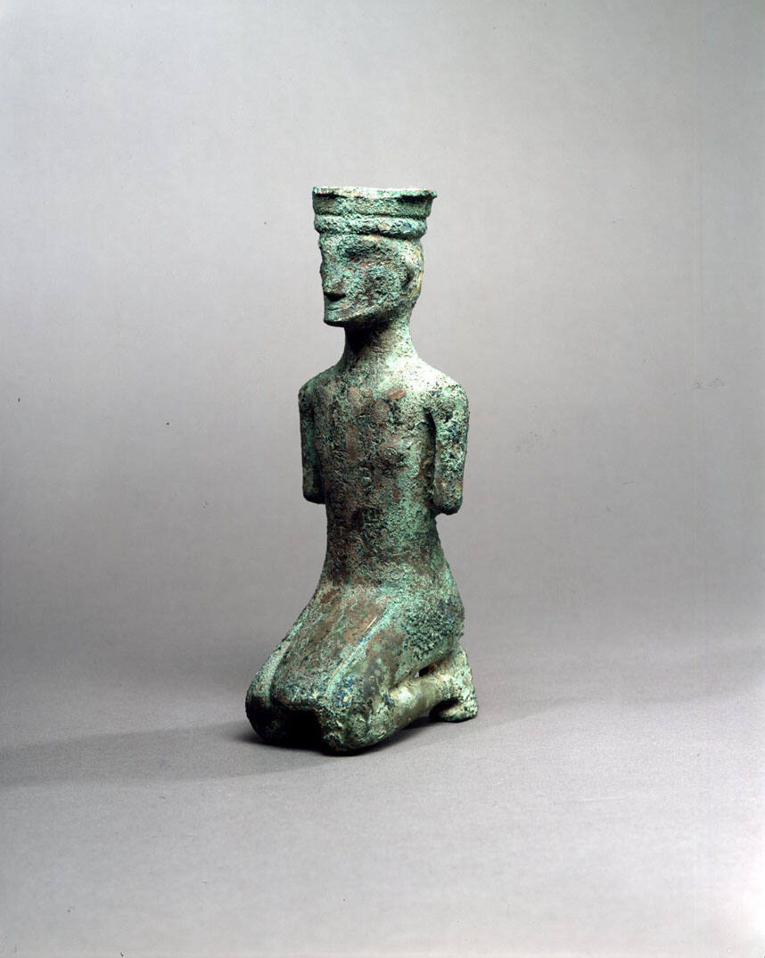 This unique figure, his hands tied behind his back, probably represents a prisoner. An inscription cast on the front of this piece commemorates a victory of the Jin state over barbarian tribes to the south and it is possible that the figure portrays a defeated leader of these tribes.