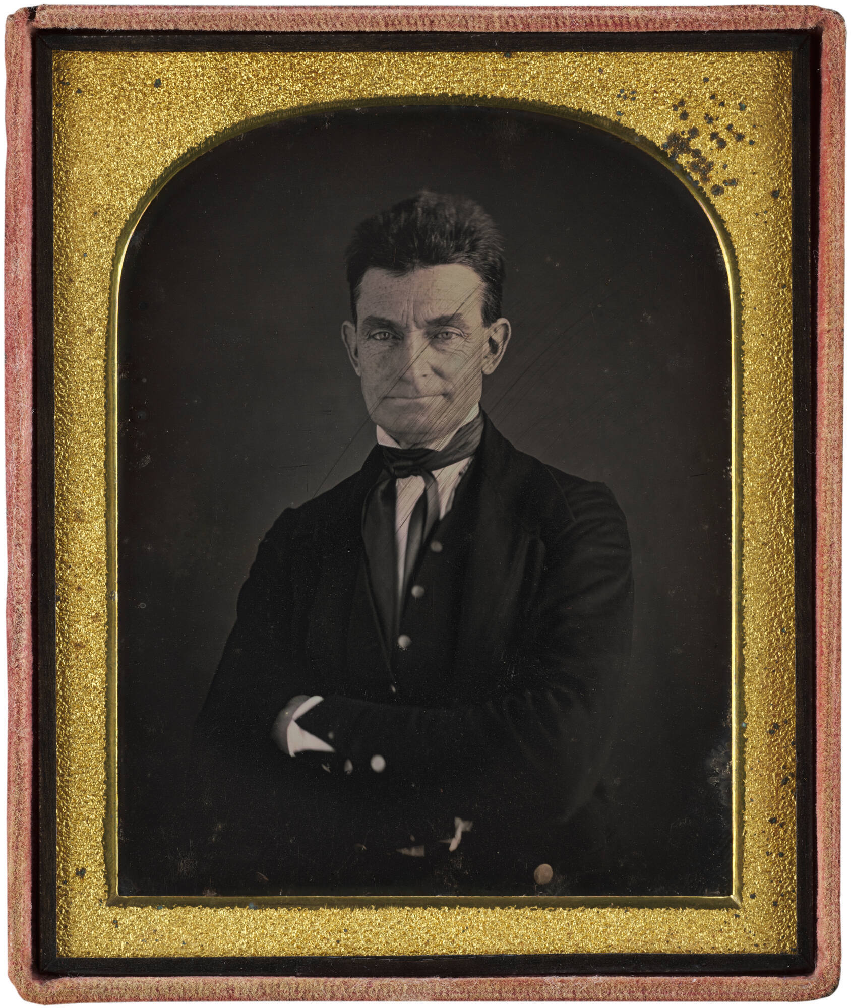 DescriptionImage of a man (John Brown), taken from waist up, with arms folded across his chest. This is quarter plate cased daguerreotype is housed in a brass mat inside of a brown case with a red satin liner.Exhibition History