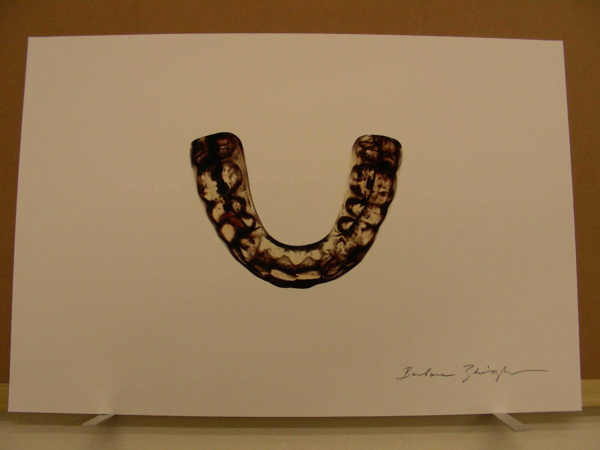 DescriptionAdult upper row of teeth (dentures) with gold on white background. Print from a portfolio of 35 works by 33 artists from the book "Printmaking at the Edge", published in London, England.Copyright© Barbara Ziegler