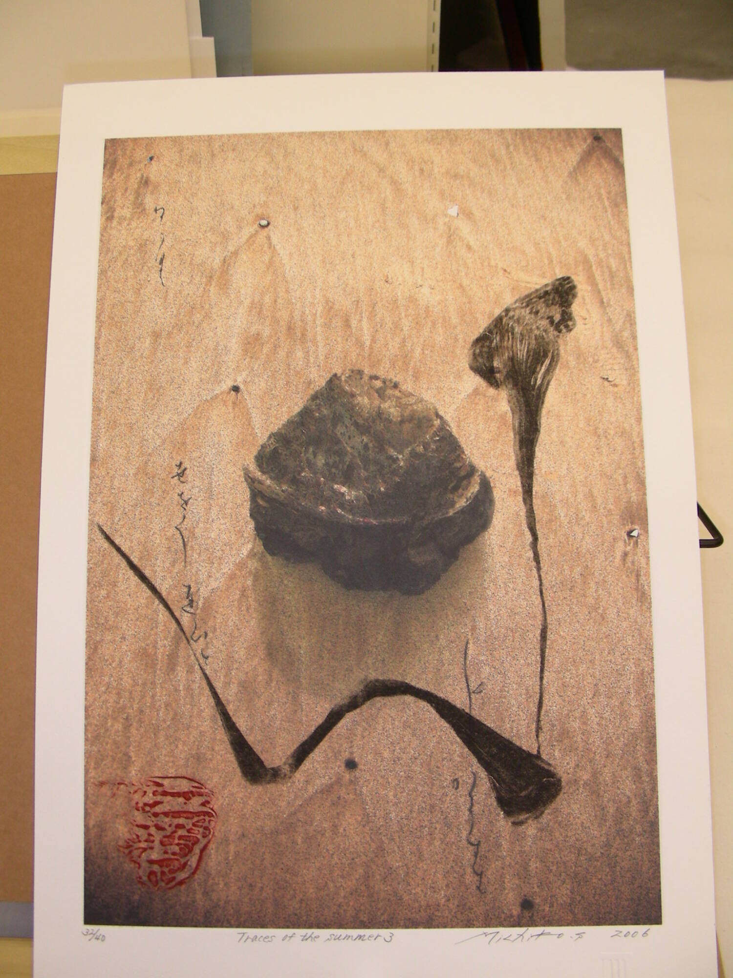 DescriptionRock with black ink calligraphy, partial red ink stamp at lower left.Copyright© Michiko Suzuki