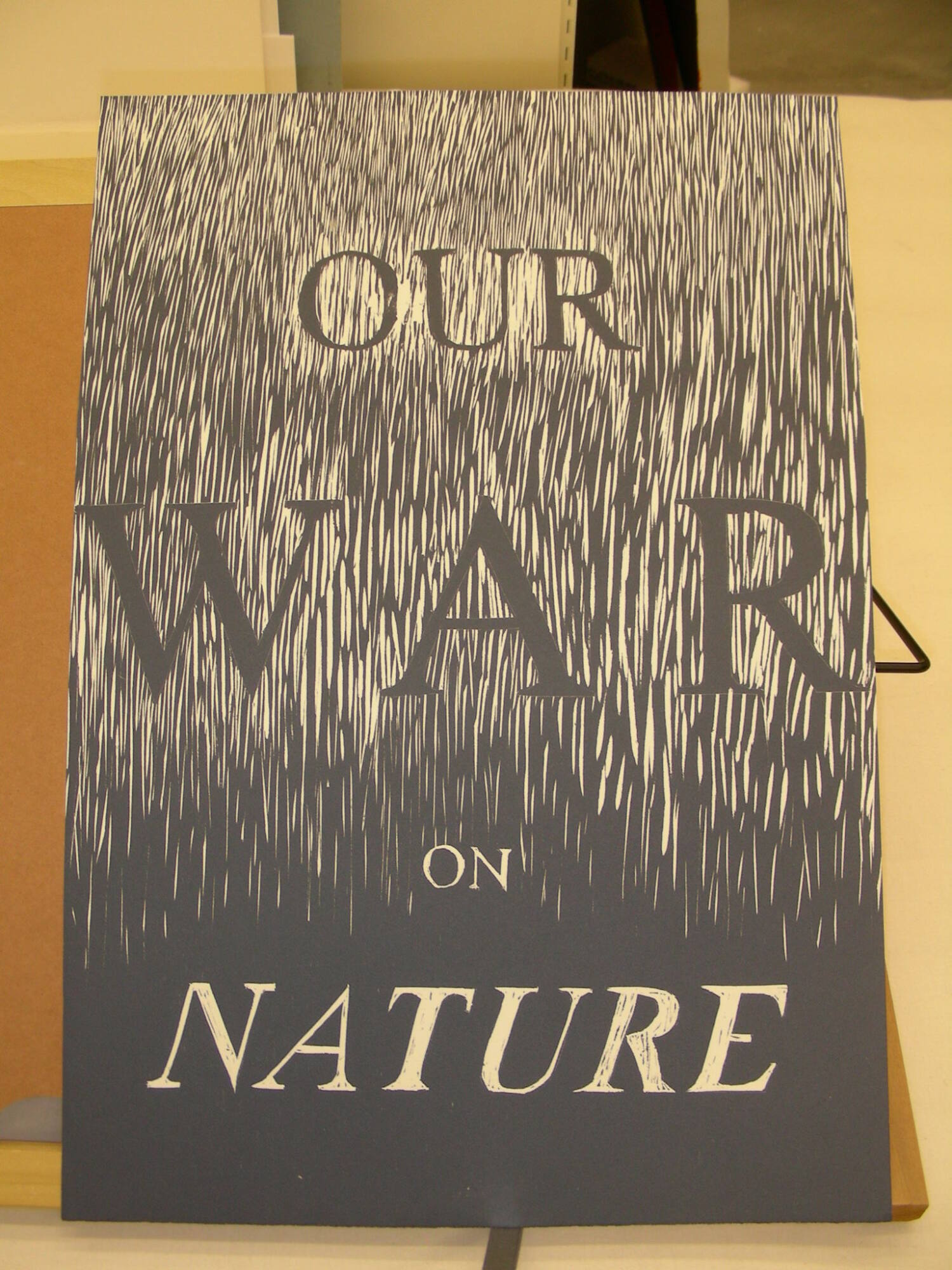 Description"Our War on Nature" is printed against a background of hatchmarks that coalesce into a solid black field behind the word "nature".Portfolio of 35 works by 33 artists from the book "Printmaking at the Edge," published in London, England.