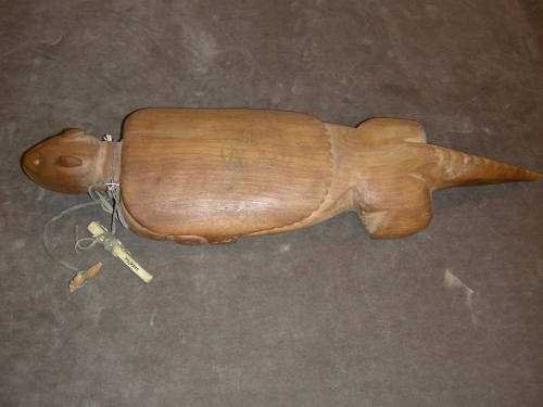 This powerful carving was made by a Mesquakie artist to replicate a sacred object never intended for public display. It represents both a snapping turtle and manitou, or supernatural being, one of the underwater powers inhabiting the Mesquakie cosmos. The object is one of a small number of works created to assist an anthropologist who was studying Mesquakie mythology, religion and material culture. It provided the scholar, and now the outside world, with a view into a sacred realm. The original object is revealed only to appropriate tribal members during ritual use.