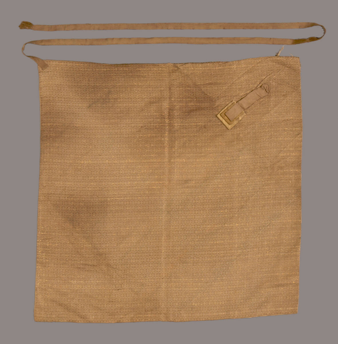 DescriptionAll-over pattern of interlocking circles with small floral center. Gold on tan ground, and silk lining. Cord attached to one corner.
