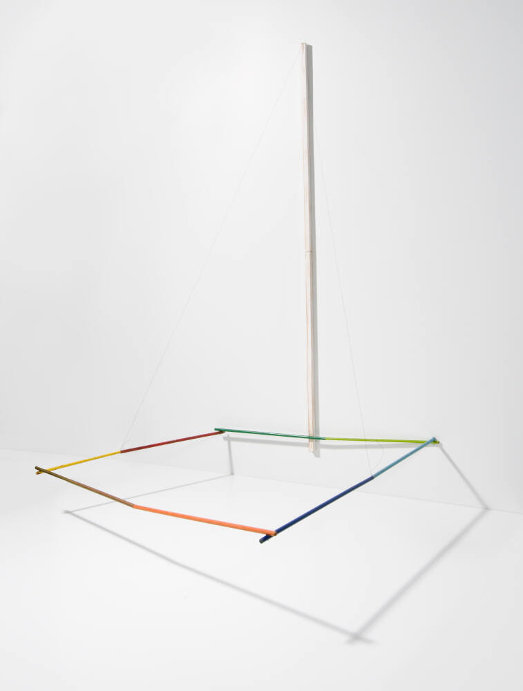 DescriptionThis sculpture is made of 8 brightly colored broomsticks, two wires, and a slender strip of white wood vertically mounted tot he wall. The broomsticks are yellow, red, green, and blue. The broomsticks are arranged in a rectangular configuration and form an invisible plane that is perpendicular to the wall and parallel to the floor.Gallery Label
