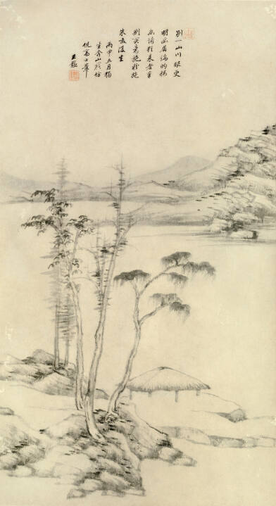 In this tranquil river scene, Wang Jian pays tribute to Ni Zan (1301-1374), an icon of Chinese landscape painters. Ni Zan’s work influenced generations of artists, who sought to emulate his light brushwork, simple compositions, and understated simplicity. Floating above, a poetic inscription describes the peaceful vista.