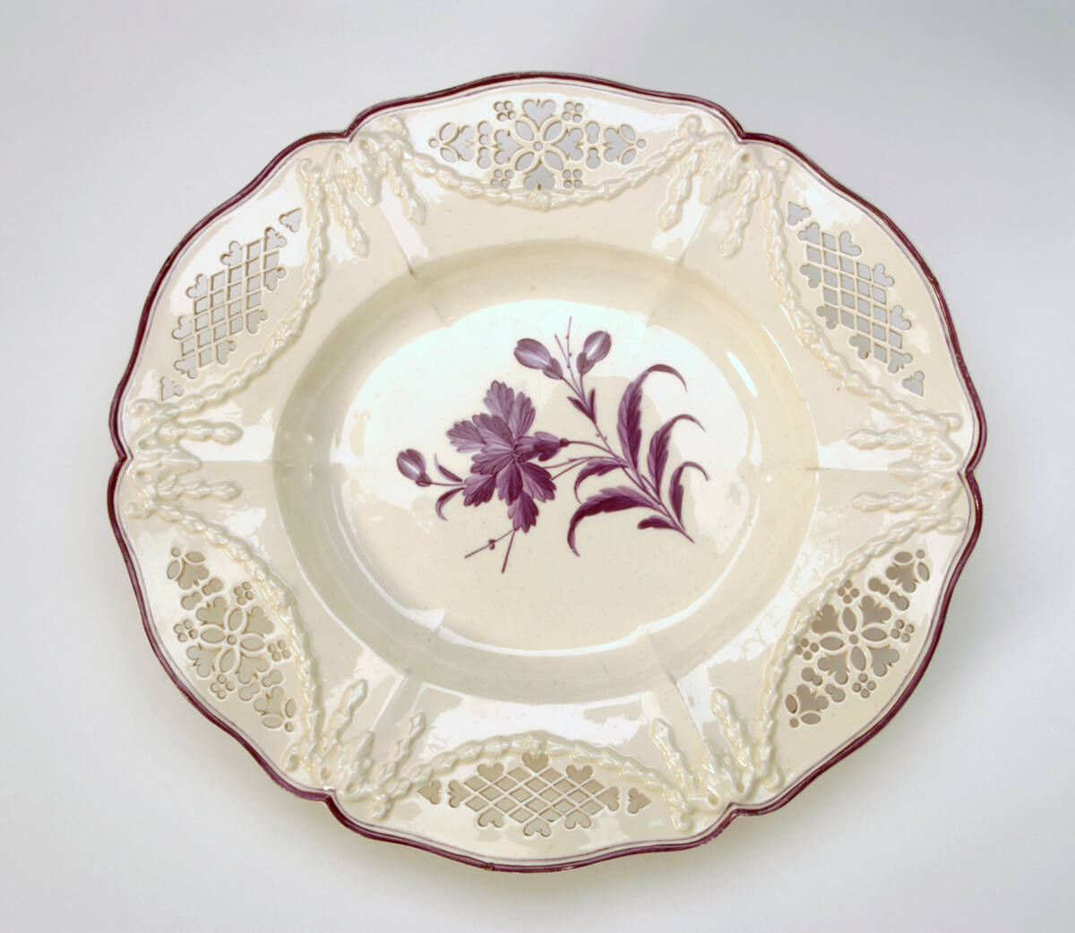 DescriptionSmall shaped oval contour dessert plate with reliefs of swags and cascades. Purple banding on rims decorated with purple floral sprays. Pierced designs.Provenance
