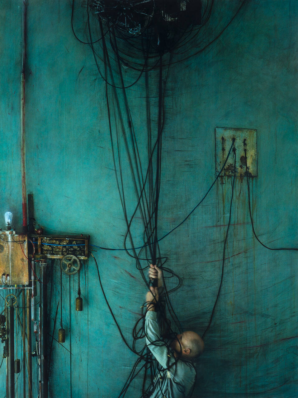 DescriptionLarge-scale color image of a man (the artist, Robert Harrison) grasping a tangle of black electrical cords that hang from an aqua-blue wall.Exhibition History