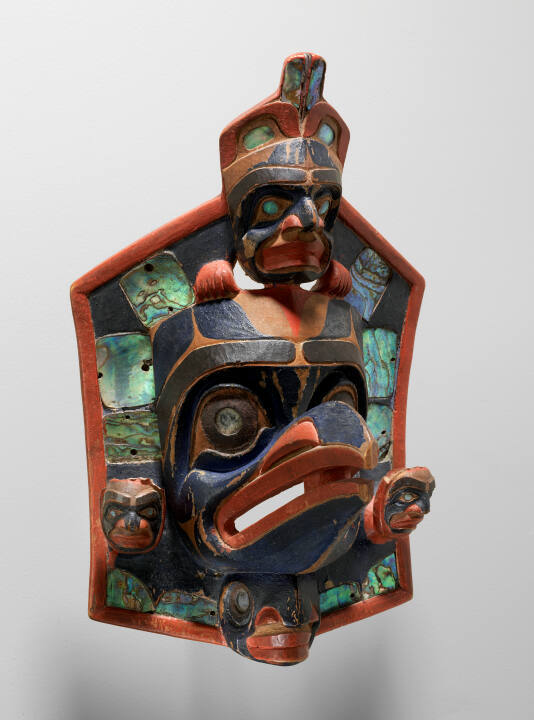 DescriptionCarved wooden mask like form with the image of a bird's head surrounded by abalone with small faces at the top, sides and bottom.Gallery Label