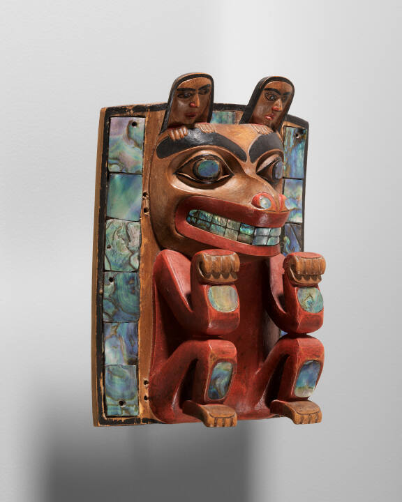 DescriptionSmall wooden plaque-like object carved with a representation of a bear on its haunches bordered by abalone shell inlay.Gallery LabelHeaddress frontlets are carved wooden plaques that form the primary element of elaborate ceremonial headdresses. Positioned above the forehead of the wearer, they were attached to a semi-cylindrical framework made of wood or whale baleen, which was further ornamented with various materials from the creatures of the earth, sky and sea. This carving represents a bear sitting on its haunches with its forefeet held upward. The small human faces carved in the bear's ears are likely references to mythological tales of marriage between bears and humans, which brought about the origin of certain Haida clans.