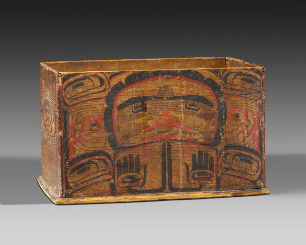 DescriptionWooden rectangular chest with primary design of face and human hands.