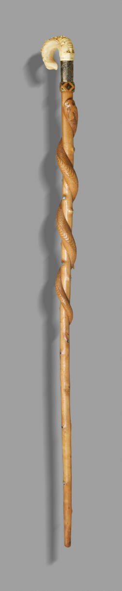 DescriptionCarved wooden cane with serpent and carved with ivory finial depicting a man and an otter.Gallery LabelCharles Edenshaw is perhaps the best known and most accomplished of all Haida artists of the historic period. His works are known for their superb artistry and craftsmanship, and both his creations and extensive knowledge of Haida traditions were eagerly sought by museums and anthropologists. These canes are three of perhaps a dozen elaborate versions he is known to have produced over a 25-year period. Most were made for presentation or as gifts to important and respected officials and dignitaries.