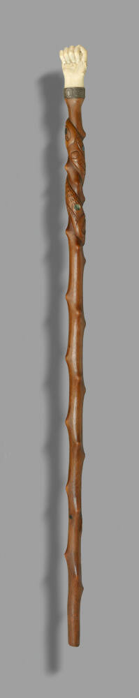 DescriptionCarved wooden cane with carved ivory finial in the shape of a human hand.Gallery LabelCharles Edenshaw is perhaps the best known and most accomplished of all Haida artists of the historic period. His works are known for their superb artistry and craftsmanship, and both his creations and extensive knowledge of Haida traditions were eagerly sought by museums and anthropologists. These canes are three of perhaps a dozen elaborate versions he is known to have produced over a 25-year period. Most were made for presentation or as gifts to important and respected officials and dignitaries.