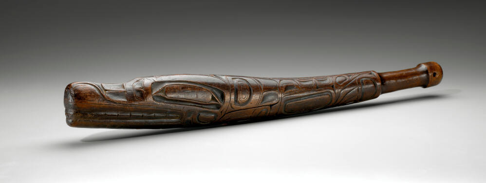DescriptionWooden club in the shape of an elongated animal depicted through stylized relief carving.Gallery LabelClubs of this type were commonly used for killing seals and sea otters taken with harpoons, as well as halibut and salmon. Few, however, were as elaborately decorated as this finely balanced carving. The club is covered with imagery carved in relief representing a sea lion, one of the region's strongest and most efficient sea hunters. The expertly conceived design, while abstract, clearly depicts the features of the animal's head as well as its body, joints and flippers along the sides of the club's shaft.