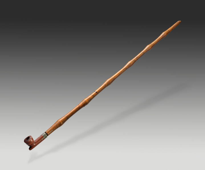 The use of tobacco as a sacrament was a central feature of many American Indian cultures throughout North America. Pipe ceremonialism was highly developed in the Woodlands, Prairie and Plains regions, and pipe bowls and wooden stems were among the most important sculptural forms produced by Native American men. This finely carved calumet is distinguished by the undulating contour of the stem and its elegant proportion. The irregular linear pattern resulting from the exposed wood grain was used to great effect in both defining and emphasizing the stem's rhythmic sculptural volumes.