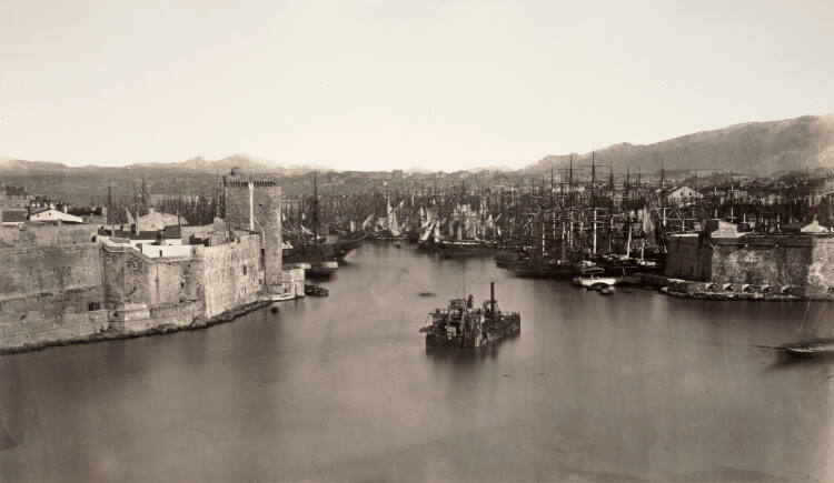 DescriptionImage of the Marseilles harbor; ships with sails and masts line the right side of the harbor. On the left, the city sits behind a large fortified wall right next to the water.