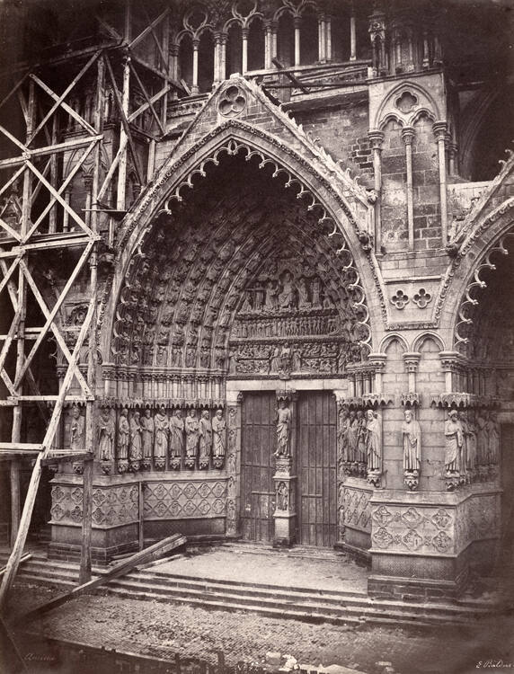DescriptionImage of an elaborately carved front doorway of a Cathedral. Carved sculptures surround the double door; there is scaffolding constructed to the left of the composition.Gallery LabelBuilt largely between 1220 and 1288, Amiens Cathedral is an outstanding example of French Gothic religious architecture. The extensive sculptures seen here on one portal depicted biblical saints and stories and were meant to educate worshippers at a time few people could read. Édouard-Denis Baldus, one of France’s most accomplished architectural and landscape photographers of the 1850s and 1860s, here pictures Amiens with bold, formal clarity. Baldus photographed many historic cathedrals and monuments throughout France, to document the nation’s architectural heritage.