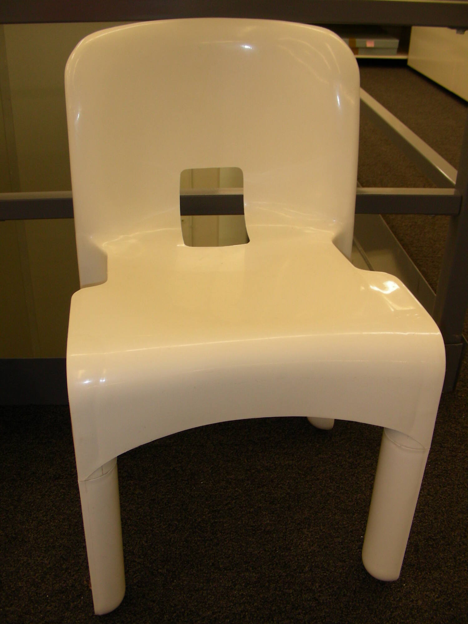DescriptionSide chair made of white injected-molded plastic. The seat, back and skirt are of one piece of plastic with a rectangular opening at the lower back. The four legs, which fit into openings integral to the seat, are rounded on the inside and flat on the outside.CopyrightThis work is copyrighted. Contact the copyright holder for permission to reproduce.