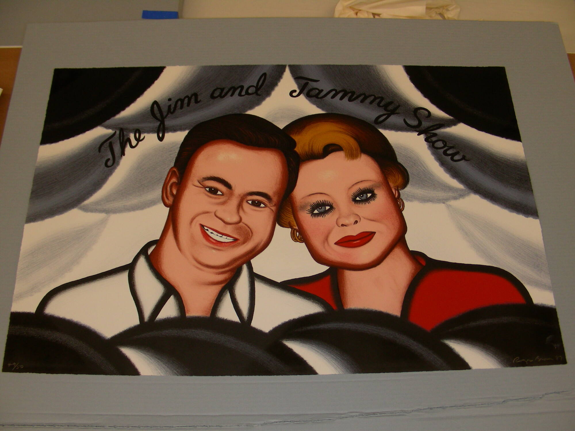 DescriptionPortrait of Jim and Tmamy Faye head to head looking out and smiling at us. They are surrounded by black, grey and white billowing shapes.Copyright© Roger Brown