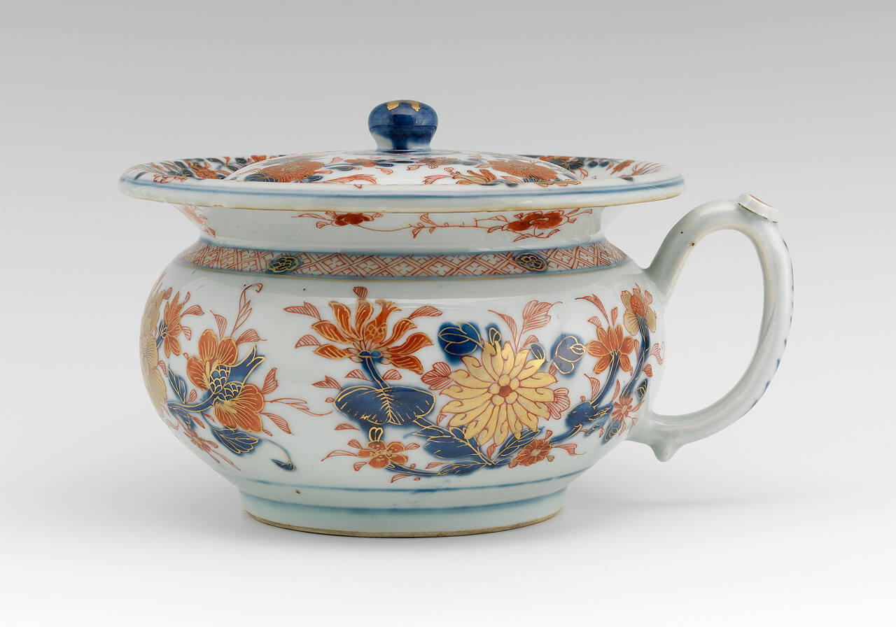 DescriptionCircular, white porcelain lidded, handled pot with underglaze blue and brick red enamel decoration of flowers. The exterior of the base is decorated with two registers of flowers. Relatively large-scale chrysanthemum-style flowers on red with gilded centers decorate the exterior of the bowl of the pot; above is a band with a red trellis pattern and around the underside of the rim, red enameled flowers. The top of the rim is painted with densely packed blue and red flowers with gilding. The handle is decorated with a red, enameled heart near the bowl's rim with flowers descending on the outside of the handle. The interior of the base is undecorated. The lid is painted with underglaze blue and red, enameled flowers with gilding; the finial or handle of the lid is decorated with underglaze blue and a gilded star motif.