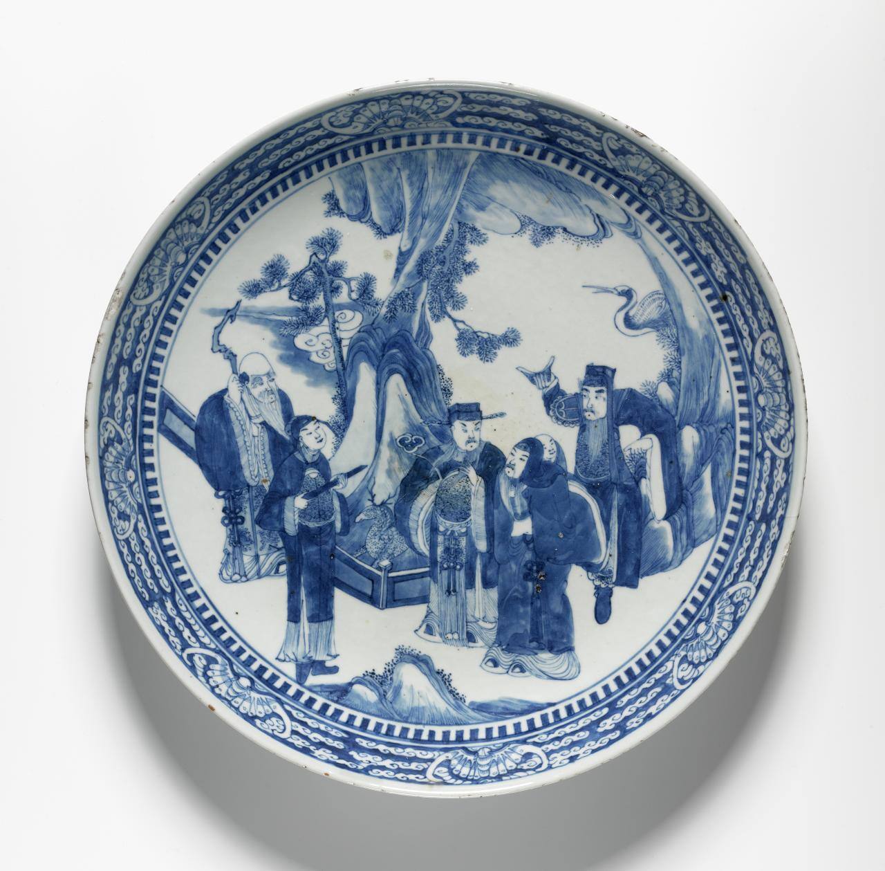 DescriptionThe large porcelain plate has a footring, shallow dish, and curved rim. It is decorated with figures, landscape, animals and flower in underglaze blue. The main image on the front shows six figures in a garden setting. The front rim is consisted of eight bats on a background of cloud scrolls. On the reverse side, bamboo branches are decorated on the outer rim. The making period is marked in the center of the bottom.Gallery LabelThis blue-and-white porcelain plate is adorned with three folk gods that greet visitors of a household. These folk gods and their attendants represent fortune, career and longevity. The fortune god wears a hook and holds a boy on his back. Behind him, an attendant holds a gold ingot, ancient Chinese currency. The career god wears an official’s cap with two wings and holds a ruyi scepter. The longevity god is an old man holding a cane. Other images that represent wishes for longevity include a pine tree, a crane and a deer. The bats along the rim of the plate create a Chinese pun for good fortune.