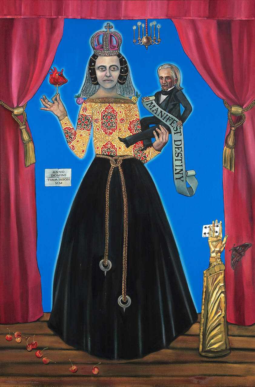 Description"Manifest Destiny (Sarah Polk)" depicts a standing female wearing a crown, an elaborately patterned flat bodice and black skirt. She is framed by red curtains and set against a blue background. In her right hand, she holds a red heart pierced by an arrow/cross, and in her left, a miniature version of a gray-haired man in a suit holding a banner that reads: "Manifest Destiny". Also depicted are a suspended ceiling candelabra, a golden reliquary arm holding a playing card, a moth, and red cherries scattered on the floor.