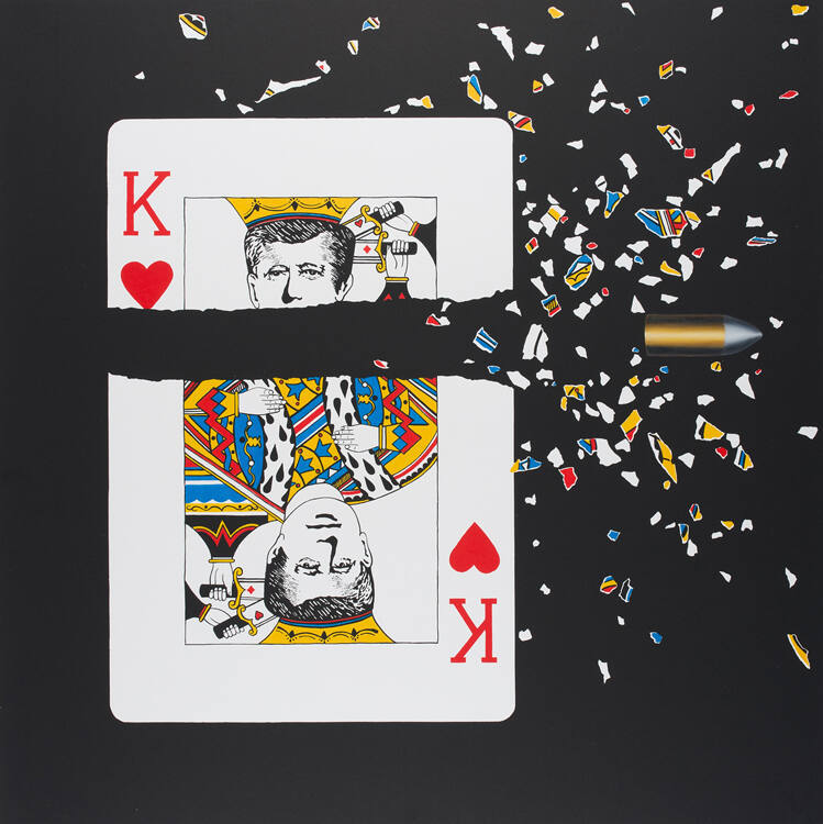 Description"Stop Action Assassination" depicts a playing card, the King of Hearts, featuring President John F. Kennedy as the King, shot through by a speeding bullet. The card is set against a black ground.