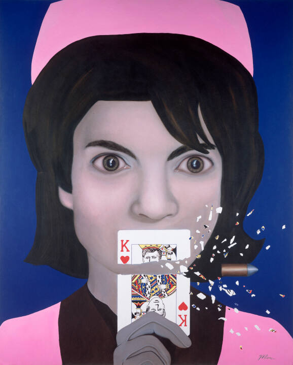 DescriptionThis work of art depicts Jacqueline Kennedy wearing a pink pill box hat and jacket. Her portrait is framed by a dark blue ground. The former first lady holds a King of Hearts playing card (with President John F. Kennedy as the King), shot through by a speeding bullet.