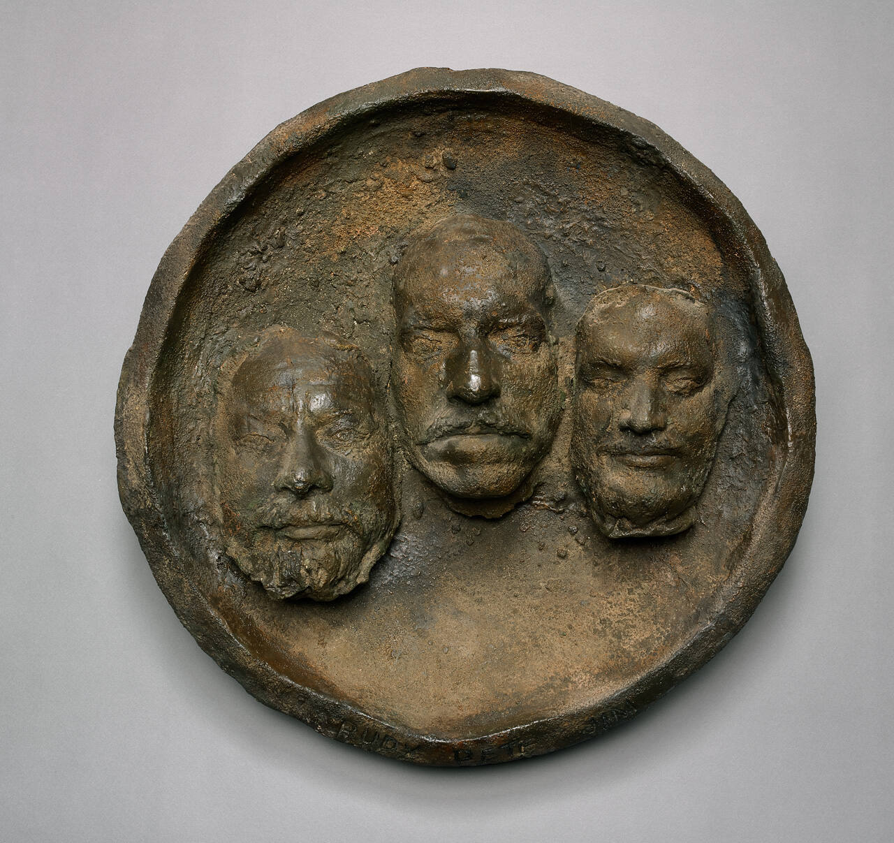 DescriptionA large, round, bowl-shaped vessel of coarse clay in various brown tones, having three male portrait heads in relief in the center of the vessel, with the names "Rudy," "Pete" and "Jim" inscribed into the bottom edge of the vessel's rim.Gallery LabelThis monumental charger tells a story about the friendship and collaboration of three giants of American contemporary ceramics. The artist Jim Leedy inserts himself between two of his best friends and fellow ceramic pioneers, Rudy Autio and Peter Voulkos. The three are credited with introducing the vibrant painting movement Abstract Expressionism to the medium of clay. Leedy has also played an important role in the development of Kansas City artists and collectors: he taught at the Kansas City Art Institute from 1964 to 2009 and established the Leedy-Voulkos Art Center/Gallery.