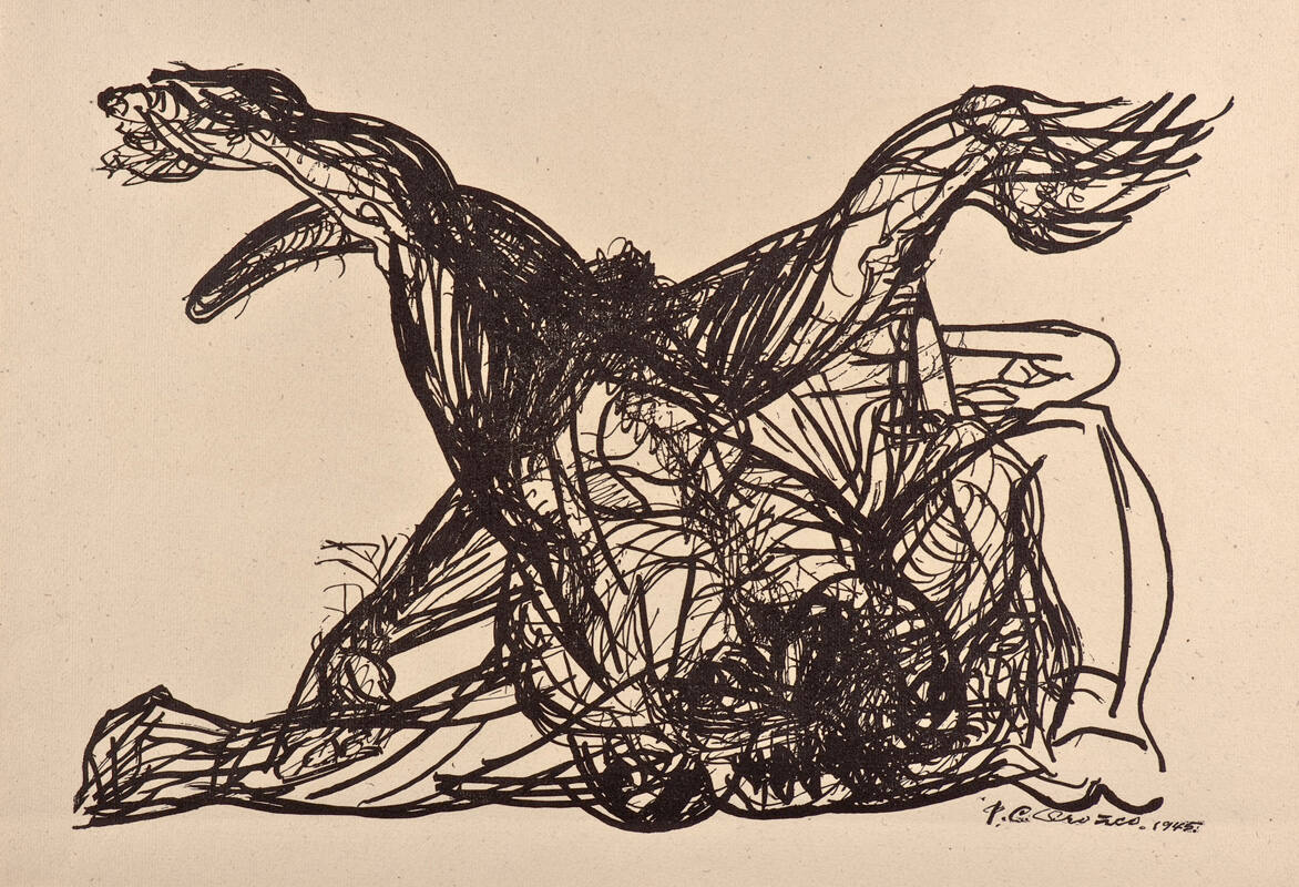 DescriptionPrint depicting a figure lying on a floor with feet upGallery LabelUntitled depicts abstract figural forms struggling mightily on the ground. Along with Diego Rivera and David Alfaro Siqueiros, José Clemente Orozco established the Mexican Mural Renaissance. All were devoted to politically charged, social realist art focused on the themes of human suffering and ennoblement. Orozco was particularly concerned with the fight of the oppressed against the oppressor. The abstract forms and forcefully drawn marks in Untitled convey a sense of human and animal forms locked in an intense battle. It embodies dialectic oppositions: