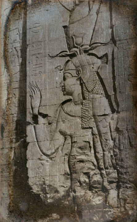 DescriptionImage of a close up of an Egyptian figure carved into the side of the monument. The figure has an elaborate headdress and one arm raised.Exhibition HistoryExploring Egypt: 19th Century Expeditionary Photography. The Nelson-Atkins Museum of Art, Kansas City, MO, March 6 - July 18, 2010, no cat.
