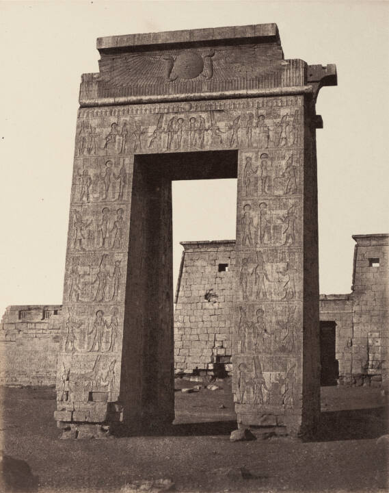 DescriptionImage of a stone doorway covered with hieroglyphics; another stone structure is in the background.Exhibition HistoryExploring Egypt: 19th Century Expeditionary Photography. The Nelson-Atkins Museum of Art, Kansas City, MO, March 6 - July 18, 2010, no cat.