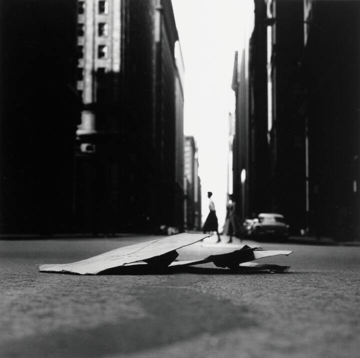 Placing his camera at street level, Ray Metzker chose discarded cardboard as the focal point for this photograph, putting the women crossing the street and surrounding buildings in the background out of focus. This unique vantage point positions the central woman in the photograph so that she is surrounded by bright light on this remarkably quiet street in downtown Chicago.
