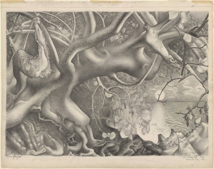 DescriptionRoss Eugene Braught's large graphite on paper drawing Sea Grape, Marina Cay--- B. V. I., 1942, describes the accutely observed twisted trunk; curving branches; smooth, slightly-mottled bark; and round, leathery leaves with prominent veining associated with the tropical tree known as the sea grape. The sprawling tangle of branches in the foreground of the composition opens up in the lower right to reveal a view of an uneven, sandy shore. Beyond the beach with its small wind-shaped dunes, the calm waters of the Caribbean lagoon are lit by a full moon that has just started its rise in the cloud-filled night sky.Gallery Label