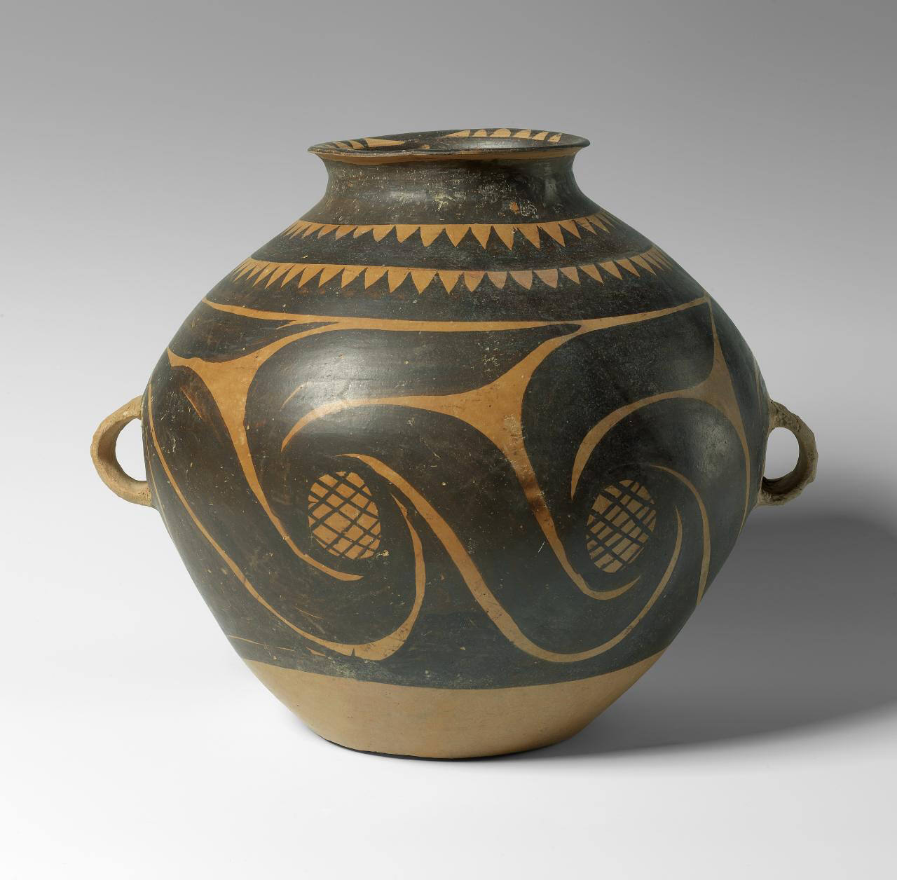 DescriptionThe jar has a globular body, a wide mouth with flaring rim, two small loop handles in the waist, and a flat rimless base. The brick-red vessel is painted with dark-brown decoration in the body, while the bottom and two handles are left blank. The mouth rim and the shoulders are painted with saw-tooth patterns. The middle section of the body is painted with foliate scroll motifs, which spiral around two central medallions on both the front and rear side. The surface of the jar was burnished creating a smooth finish.