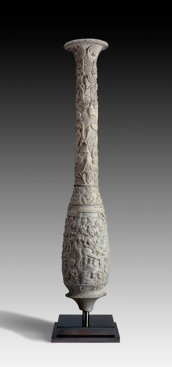 Princes and palace attendants, crouching demigods and winged goddesses entwined in lotus stalks inhabit the richly carved surface of this elegant vessel.