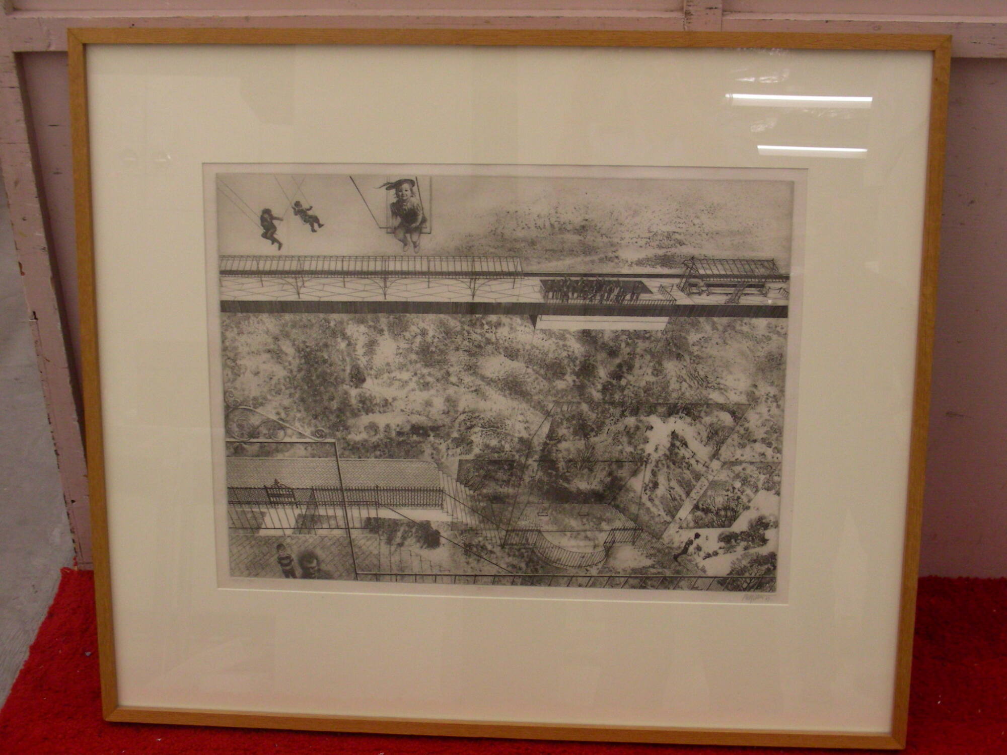 DescriptionA black and white overview of a playground with a distorted perspective. There are three children swinging at the top of the page, with a group of spectators at center right, while the mid ground is filled with fences trees, other natural things, and the bottom area is a series of stairways. All seen from above.Gallery LabelPeter Milton’s Pastorale is an imaginative depiction of people in an urban, park-like landscape. Its meaning is intentionally ambiguous. In the upper left, three people are swinging, but the activity takes place at a dizzying height and within an unreal spatial context. To the right, a group of men wave frantically. The image is replete with distortions of space and multiple points of perspective. Milton is known for his unique interpretation of Surrealist tendencies, which often play on bizarre juxtapositions of space, time and human activities. His prints are also characterized by their microscopic detail and pictorial complexity. Milton’s hyper-real technique is calculated to evoke a sense of surprise.