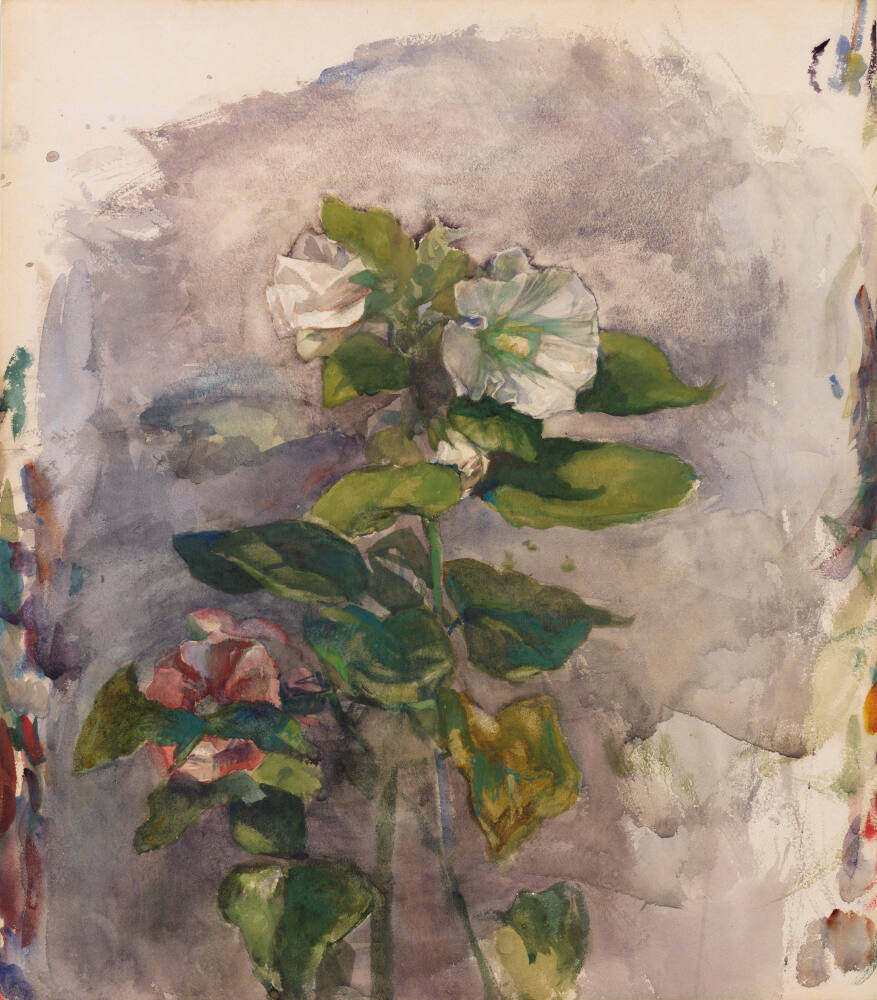 Description"Hollyhocks" is a watercolor and gouache that gives the impression of a quickly executed sketch. At the center of the painting, against an indistinct background of gray washes, two white hollyhocks and one white bud about to unfurl emerge atop a tall stalk from which several deep green leaves sprout. In the lower left, two dark pink flowers complete the expressive composition.Gallery LabelIn Hollyhocks, John La Farge layered thin, largely transparent washes of color to represent uncut