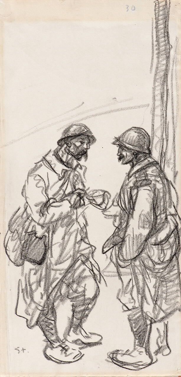 DescriptionThis drawing depicts two soldiers from the side view, wearing helmets, coats and boots. They stand, facing each other in close proximity.ProvenanceJoseph F. McCrindle (1923-2008), New York, by July 11, 2008;