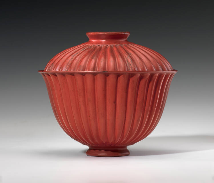 DescriptionVermillion lacquered cup and cover with a fluted pattern on both. Lid can also be used as a saucer.Gallery LabelThis cup was made by coating a molded silk core with lacquer. It is therefore much thinner and lighter than a porcelain cup would be. Imagine drinking tea or soup from the cup. You would need first to remove the lid and, according to custom, place it on the table facing up.