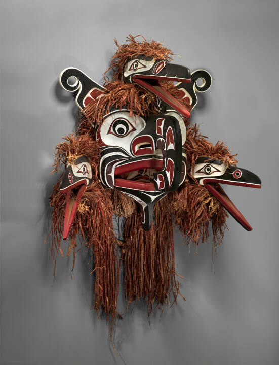 DescriptionLarge multi-faced mask comprised of central bird, three ravens and 2 others including one within the mouth; all painted white, red and black with extensive shredded cedar bark fringe.Gallery LabelThe general name for this type of mask is Moogamhl, which means Four-Face mask. Like most of its kind, it is a combination of the Crooked Beak mask (central face), two Raven masks (one each side), and a Huxwhukw mask (top center). These last three masks represent the cannibal-bird associates of Baxbaxwalanuksiwe, the cannibal spirit that energizes the dancers in the Hamatsa initiation ceremony, an elaborate winter ritual of four nights' duration. The three spirit-birds are also represented in the series of Hamatsa dances by separate masks, and Moogamhl might appear in their company, providing one's family linage owned the privilege. Beau Dick produces masks for ceremonies as well as exhibition and is known for his carving versatility in various stylistic traditions.